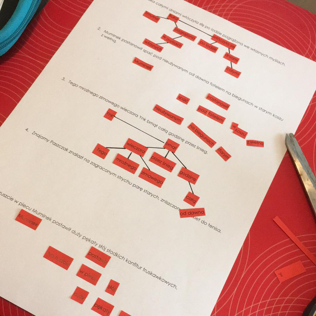 Materiał z Muminkami służy do nauki rozbioru logicznego zdania. W pierwszej kolejności do ustalenia związków wyrazowych w zdaniu (na razie bez konieczności nazywania części zdania), czyli: które wyrazy tworzą ze sobą związki i który w obrębie związku jest nadrzędny, który podrzędny.