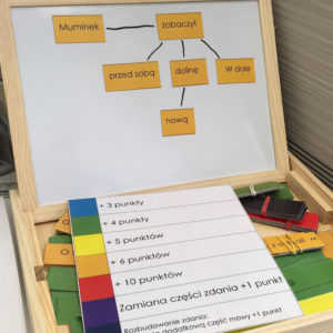 Można ten materiał wykorzystać jako grę i za ułożenie poszczególnych zadań przyznawać dziecku punkty – za zdanie niebieskie 3, za zielone 4 itd. Można te punkty zapisywać albo przesuwać pionek na planszy o tyle oczek, ile dziecko zdobyło punktów w danej rundzie.