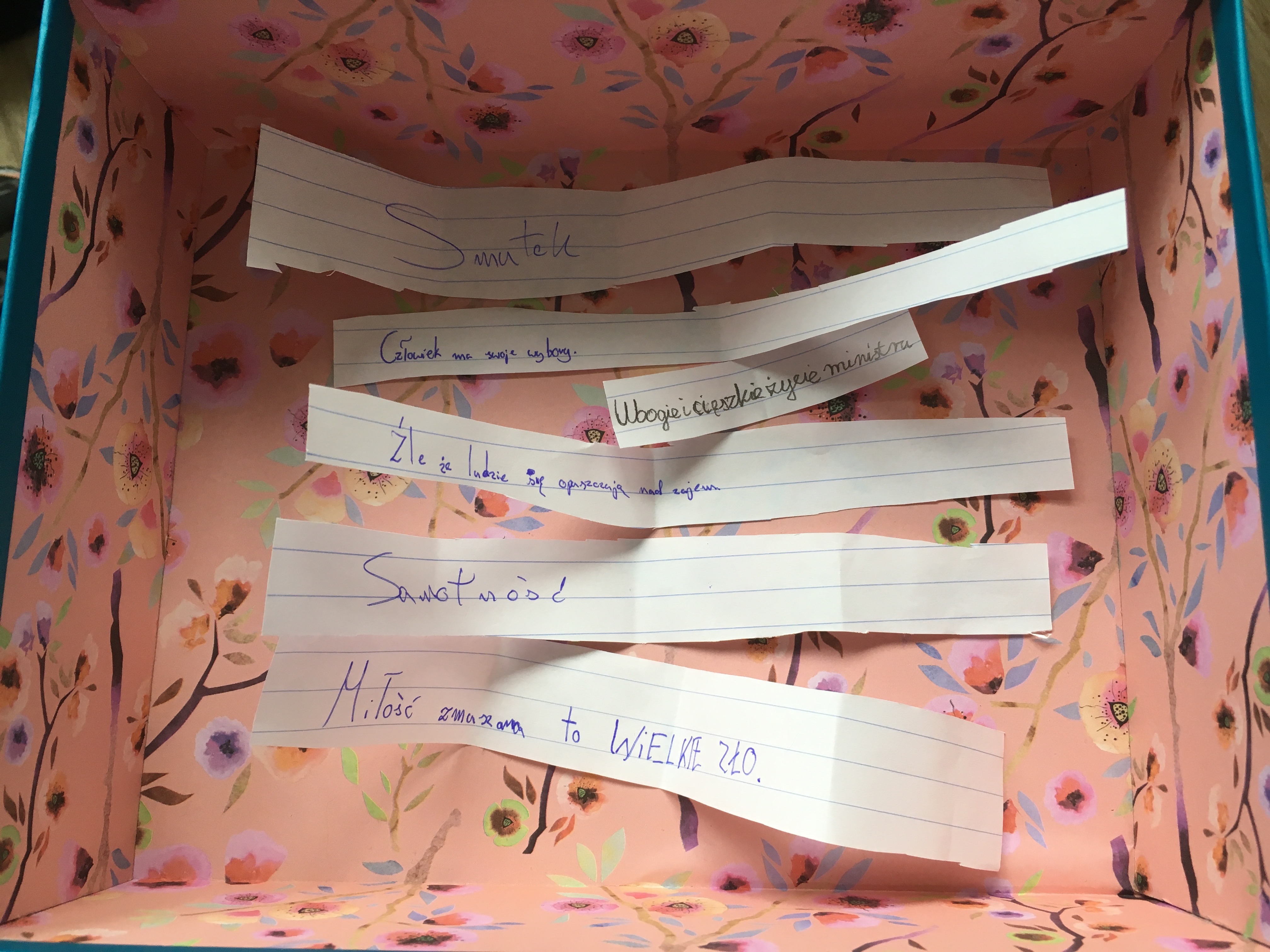 Szkatułkową strukturę narracji zamknęliśmy oczywiście w najprawdziwszych pudełkach. Na podsumowanie uczniowie napisali od siebie – i karteczki powrzucali do pudełek – o czym jest ten tekst. Bo to wcale nie takie oczywiste.