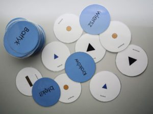 Po pierwsze, można nimi grać jak w „Doble”: Układamy kółka w stosik. Kto najszybciej poprawnie odgadnie nazwę części mowy z leżącego na wierzchu kartoniku, zabiera go do swojej kolekcji. Wygrywa ten, kto zgromadzi najwięcej kółek. Grę można prowadzić, aranżując dowolne konfiguracje różnych części mowy. Mogę na przykład wyselekcjonować same najłatwiej rozpoznawalne: rzeczowniki, czasowniki, przymiotniki, przysłówki. Albo same nieodmienne. Albo niesamodzielne. Kiedy trzeba – powiedzmy – odsiać przyimki, zaimki, partykuły, wykrzykniki, zaczyna się poziom mistrzowski ;). Albo same nowo poznane. Albo wszystkie! W charakterze wielkiej powtórki. Dzieci uwielbiają w to grać.