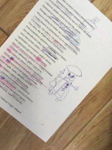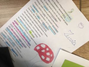 – Zabraliśmy się zatem – uzbrojeni w ołówki, kredki, pastele, nożyczki – do „przerabiania” „Grzybobrania”. Najpierw lektura. Po pewnym czasie pracy w szkole zauważyłam, że teksty trudne, nieoczywiste, naładowane archaizmami, słowami, które dźwięczą gdzieś w głowie, intuicyjnie się wyczuwa ich obecność, ale nie do końca umie się objaśnić, co oznaczają, teksty pełne zawiłych konstrukcji składniowych, których to niknące, to wynurzające się gdzieś meandry trzeba detektywistycznie wytropić i rozszyfrować, czyli po dzieciowemu: rozkminić – takie teksty intrygują i wciągają często bardziej niż te przeznaczone stricte dla dzieci, łatwe i oczywiste. Takiego Mickiewicza uczniowie otwierają powoli, niczym tajemniczą skrzyneczkę – jakich pełno w montessoriańskiej szkole – obiecującą zwartość atrakcyjną już przez to tylko, że jest ukryta, tajemnicza, na pierwszy rzut oka niedostępna. Niedostępne kusi bardziej :). Dlatego dzieci uwielbiają słuchać czytanych tekstów. Czytanie trudnego trzynastozgłoskowca to pierwszy ważne etap jego dekodowania. Uczniom o wiele łatwiej go usłyszeć niż przeczytać samodzielnie. Trzeba go przeczytać tak, żeby poniekąd przezwyciężyć jego wierszowaną strukturę, przerzutnie, szyki przestawne – wszystko wymodulować głosem tak, żeby się rozjaśniło, otwarło. Jeśli trzeba, jeśli dzieci o to proszą, można przeczytać i dwa, i trzy razy. Na na koniec zawsze oczywiście samodzielne sięgamy do tekstu, a następnie dyskutujemy o słowach/konstrukcjach dziwnych, niezrozumiałych, nieznanych. To zwykle bardzo twórcze dyskusje, sięgające różnych etymologii, wykorzystujące dziecięce intuicje.