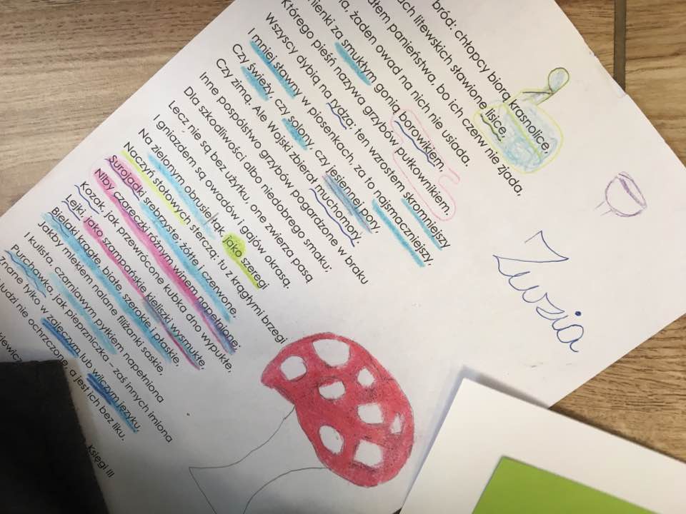 Dlatego jesienią, niedługo po tym, jak spotkaliśmy się z moimi czwartakami po wakacjach, w roku, kiedy szczególnie obrodziły grzyby, zabraliśmy się za „Grzybobranie” z Pana Tadeusza, którego wprowadzenia w szkolny kontekst obawiałam się ogromie, bo przecież wiadomo, że ulubioną lekturą dziesięciolatków na sto procent nie jest Mickiewicz. Ale w podstawie programowej się pojawił, więc trzeba go „przerobić”. Tylko na co?